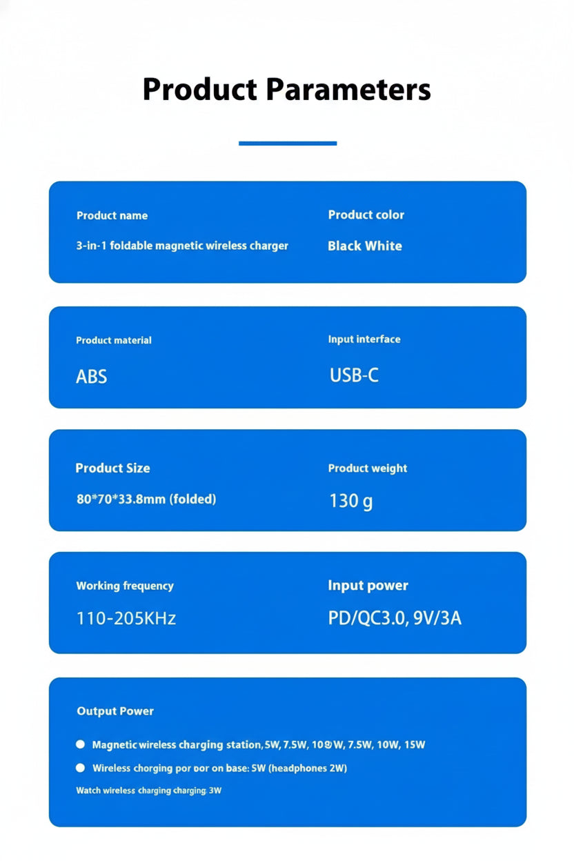 This 15W 3-in-1 magnetic foldable wireless charging station offers efficient charging for your iPhone, Apple Watch, and AirPods. Its compact and foldable design is perfect for portability, while the magnetic feature ensures a secure fit for compatible iPhone models (iPhone 16, 15, 14, 13 Pro). Charge multiple devices simultaneously with this sleek, all-in-one charging solution, designed for convenience and easy use. Ideal for home, office, or travel.